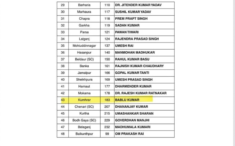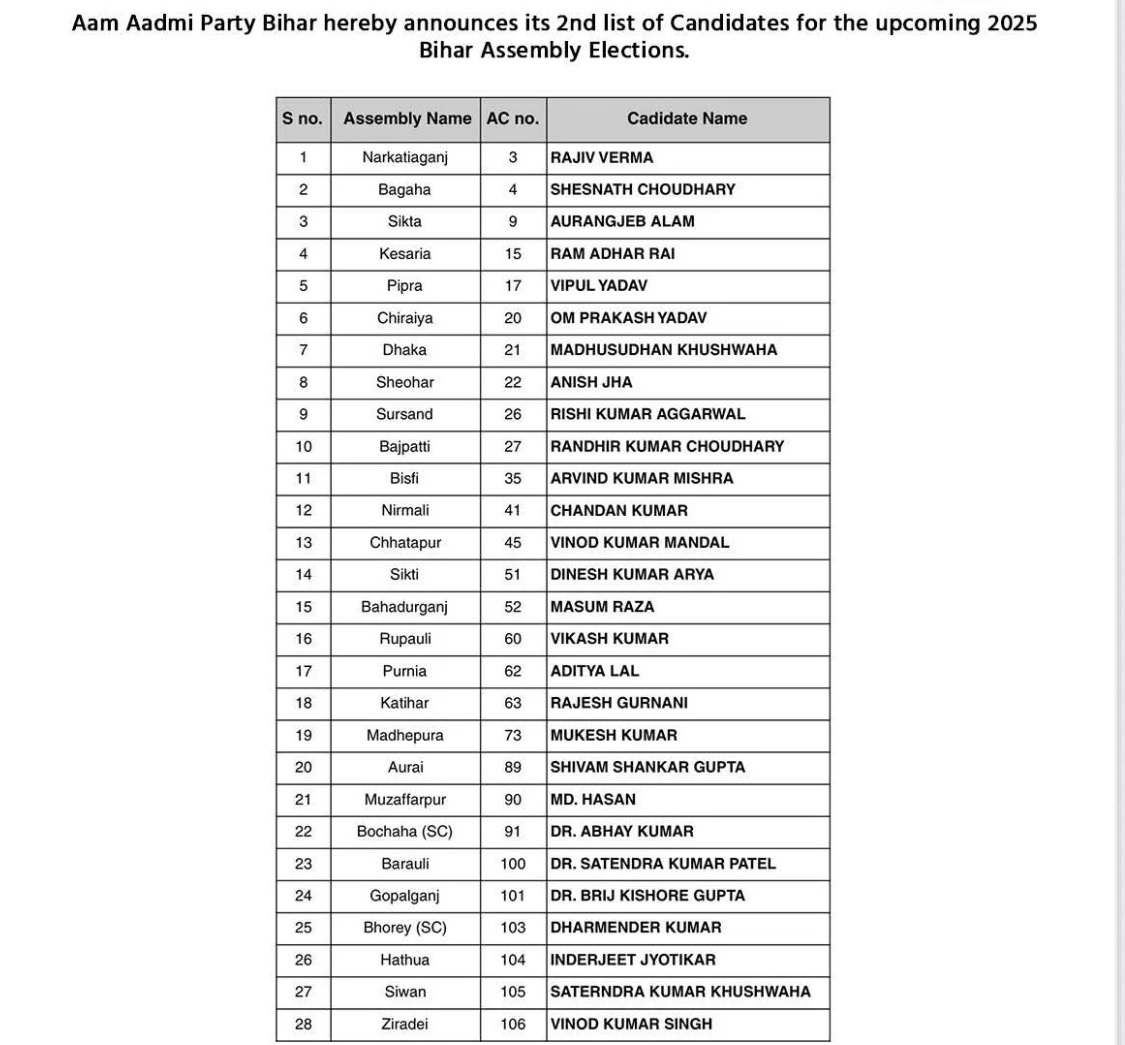 द फॉलोअप डेस्कबिहार विधानसभा चुनाव की सियासी सरगर्मी के बीच AAP ने अपनी उम्मीदवारों की दूसरी लिस्ट भी जारी कर दी है। जिनमें कुल 48 प्रत्याशियों के नाम शामिल किये है। बता दें कि इसके पहले AAP के द्वारा पहली सूची में 11 प्रत्याशियों के नाम का ऐलान किया गया था. इसके साथ ही अब तक पार्टी के द्वारा 59 सीटों के लिए प्रत्याशियों की घोषणा की जा चुकी है। आप ने पहले ही यह साफ कर दिया था कि वह बिहार की सभी 243 सीटों पर अपने उम्मीदवार खड़ी करेगी।
