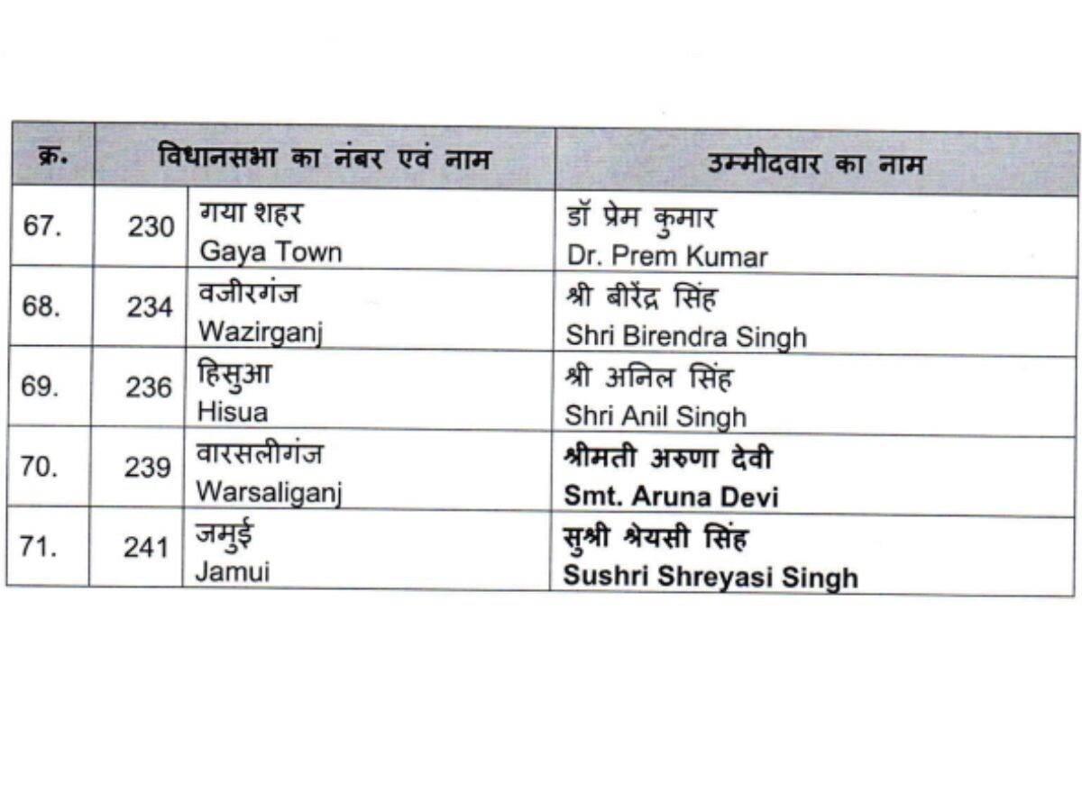 बिहार विधानसभा चुनाव 2025 को लेकर भारतीय जनता पार्टी ने अपने उम्मीदवारों की पहली सूची जारी कर दी है। इस पहली लिस्ट में कुल 71 प्रत्याशियों के नाम शामिल किए गए हैं।