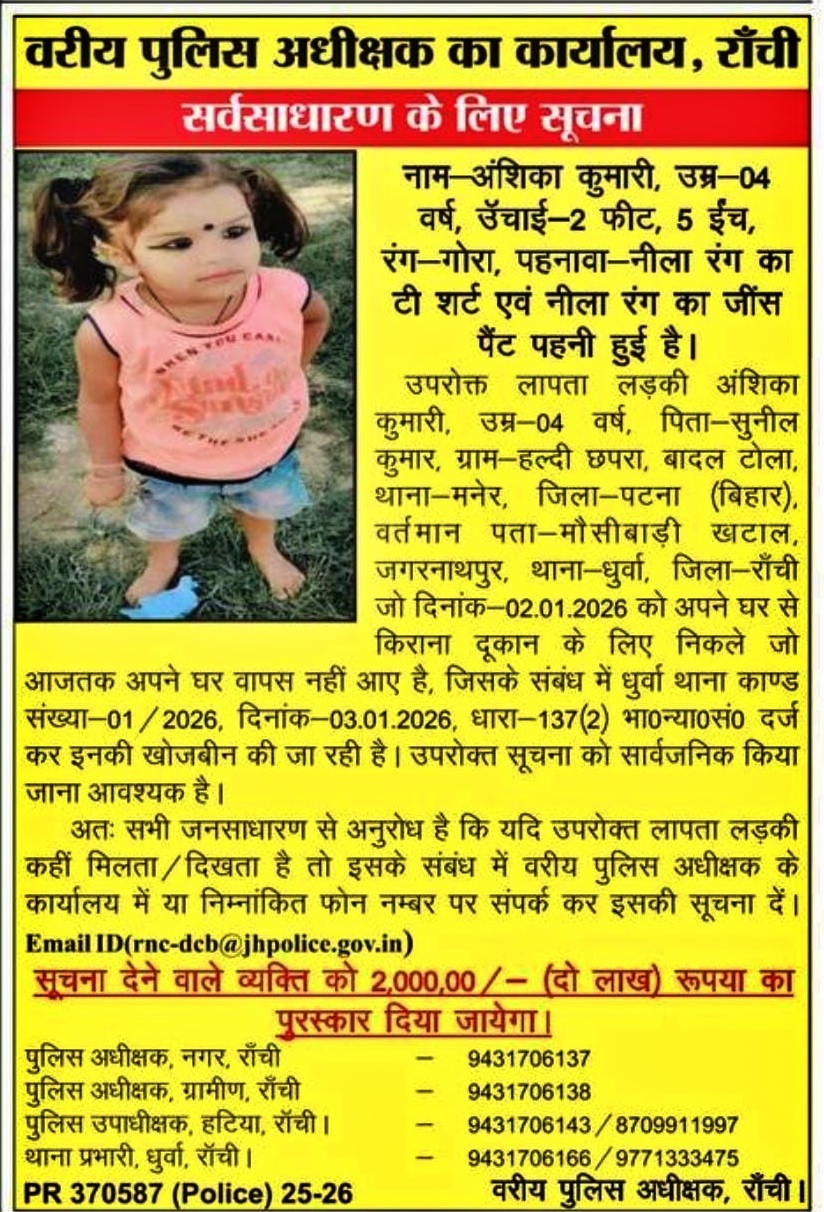 रांची के धुर्वा थाना क्षेत्र से 2 जनवरी 2026 को लापता हुए मासूम भाई-बहन अंश कुमार और अंशिका कुमारी का अब तक कोई पता नहीं चल सका है। मामले को गंभीरता से लेते हुए वरीय पुलिस अधीक्षक, रांची की ओर से आम जनता से लगातार मदद की अपील की जा रही है। साथ ही, अब रांची पुलिस ने बच्चों के संबंध में पुख्ता सूचना देने वाले व्यक्ति को 2-2 लाख रुपये का नकद पुरस्कार देने की घोषणा की है।