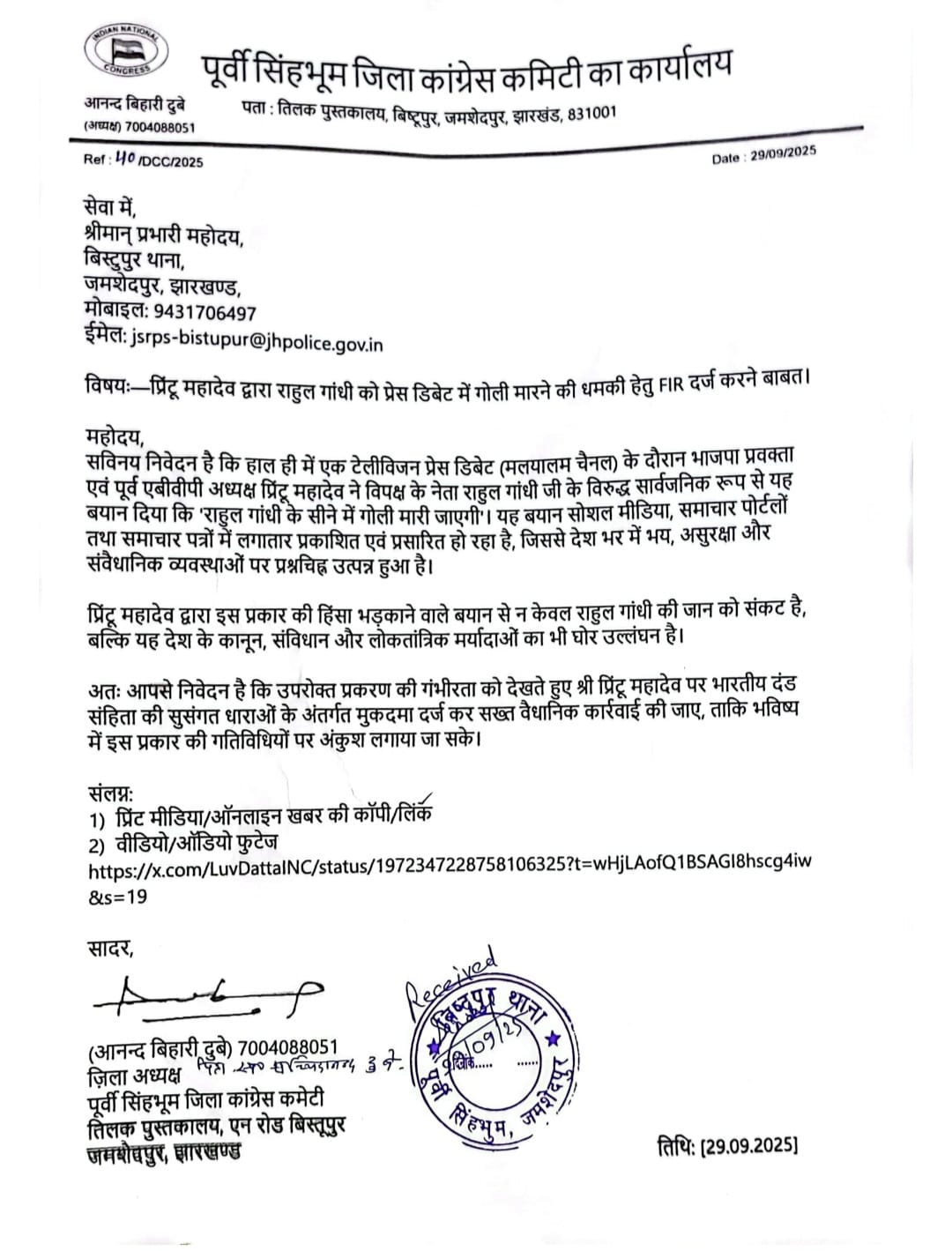 मलयालम टीवी चैनल की लाइव डिबेट में भाजपा प्रवक्ता एवं पूर्व एबीवीपी अध्यक्ष प्रिंटू महादेव द्वारा विपक्ष के नेता राहुल गांधी को सीने में गोली मारने की धमकी दिये जाने के विरोध में पूर्वी सिंहभूम जिला कांग्रेस के वरिष्ठ पदाधिकारी बिष्टुपुर थाना पहुंचे। जिलाध्यक्ष आनंद बिहारी दुबे के नेतृत्व में एफआईआर के लिए आवेदन दिया गया। जिलाध्यक्ष ने कहा कि इस तरह की भड़काऊ और संवैधानिक मर्यादाओं के विरुद्ध भाषा लोकतंत्र के लिए घातक है। यह टिप्पणी न सिर्फ राहुल गांधी की सुरक्षा को चुनौती देती है, बल्कि देश की कानून व्यवस्था और लोकतांत्रिक मूल्यों को भी कमजोर करती है।