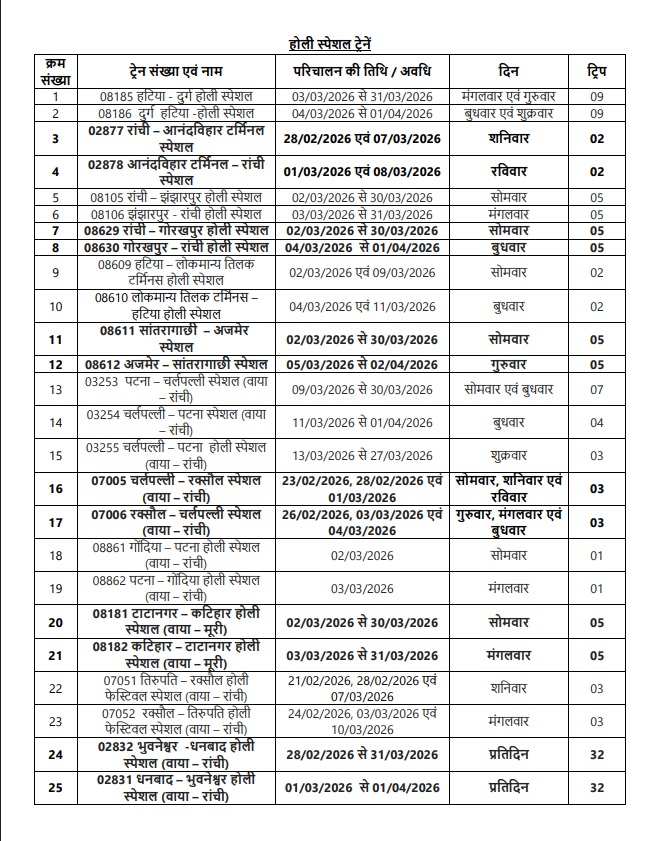 होली को देखते हुए रांची रेल डिवीजन से कई ट्रेनें चलाई जा रही है। जिसकी लिस्ट आप नीचे देख सकते हैं।