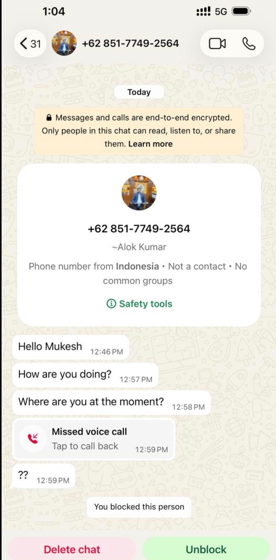 मिली जानकारी के अनुसार, इस धोखाधड़ी के लिए अपराधियों ने एक विदेशी मोबाइल नंबर +62851-7749-2564 का उपयोग किया है। इस नंबर पर उपायुक्त आलोक कुमार की आधिकारिक फोटो लगाकर एक प्रोफाइल तैयार की गई है। इस फर्जी अकाउंट के जरिए जिले के विभिन्न लोगों और अधिकारियों को संदेश भेजकर उन्हें भ्रमित करने और संभवतः वित्तीय लाभ लेने की कोशिश की जा रही है। आज, 28 अप्रैल 2026 को जैसे ही यह मामला जिला प्रशासन के संज्ञान में आया, उपायुक्त ने तुरंत इसकी पुष्टि की और जनता को सावधान रहने का निर्देश दिया।.jpeg)