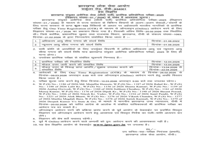 झारखंड लोक सेवा आयोग ने झारखंड असैनिक संयुक्त सिविल सेवा प्रतियोगिता परीक्षा 2025 के लिए आवेदन की तिथि को बढ़ा दी है। अब अभ्यर्थी 9 मार्च की शाम पांच बजे तक आवेदन कर सकेंगे। 10 मार्च की शाम पांच बजे तक आवेदन शुल्क जमा कर सकेंगे। जेपीएससी द्वारा जारी सूचना में राज्य सरकार द्वारा उम्र सीमा में की गयी बढोत्तरी को शामिल किया गया है। स्पष्ट किया गया है कि इस प्रतियोगिता परीक्षा के लिए अधिकतम उम्र सीमा एक अगस्त 2022 एवं न्यूनतम उम्र सीमा एक अगस्त 2026 होगी। मालूम हो कि मुख्यमंत्री की घोषणा के बाद कार्मिक एवं प्रशासनिक सुधार विभाग ने पहले ही उम्र सीमा में बढोत्तरी संबंधी आदेश जारी कर चुका था।