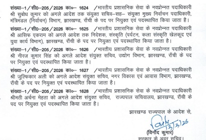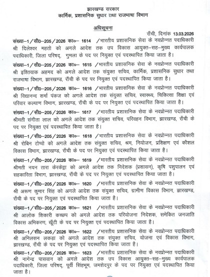 राज्य सरकार ने झारखंड प्रशासनिक सेवा से अखिल भारतीय सेवा में प्रोन्नत पदाधिकारियों प्रोन्नत अधिकारियों की आज पोस्टिंग कर दी। अधिकतर नव प्रोन्नत आईएएस अधिकारियों को उनके वर्तमान विभाग में ही बनाए रखा गया है। मालूम हो कि प्रोन्नति के बाद पोस्टिंग की तिथि से इन अधिकारियों को वेतनमान में बढोत्तरी व अन्य सुविधाओं का लाभ मिलता है।