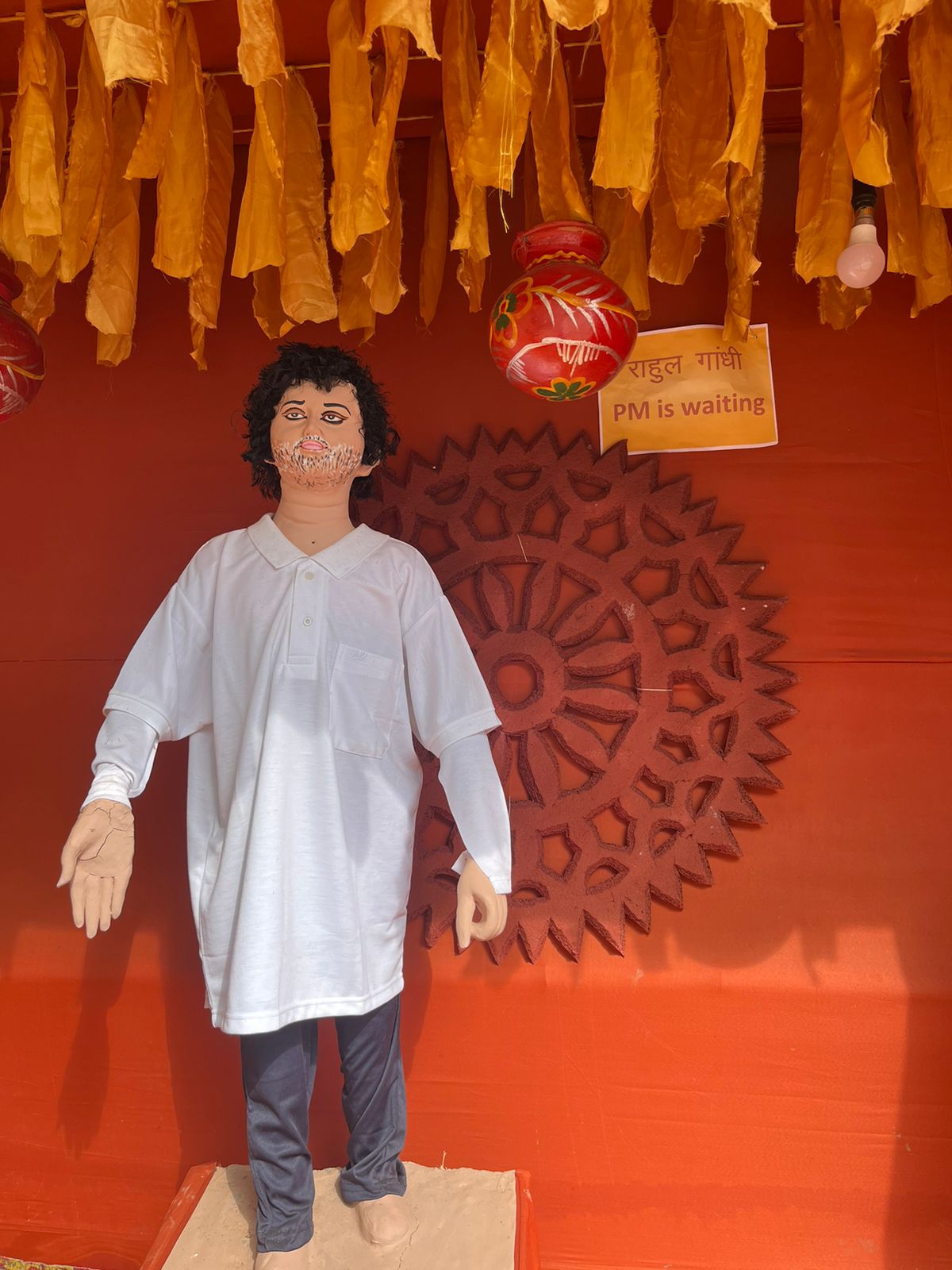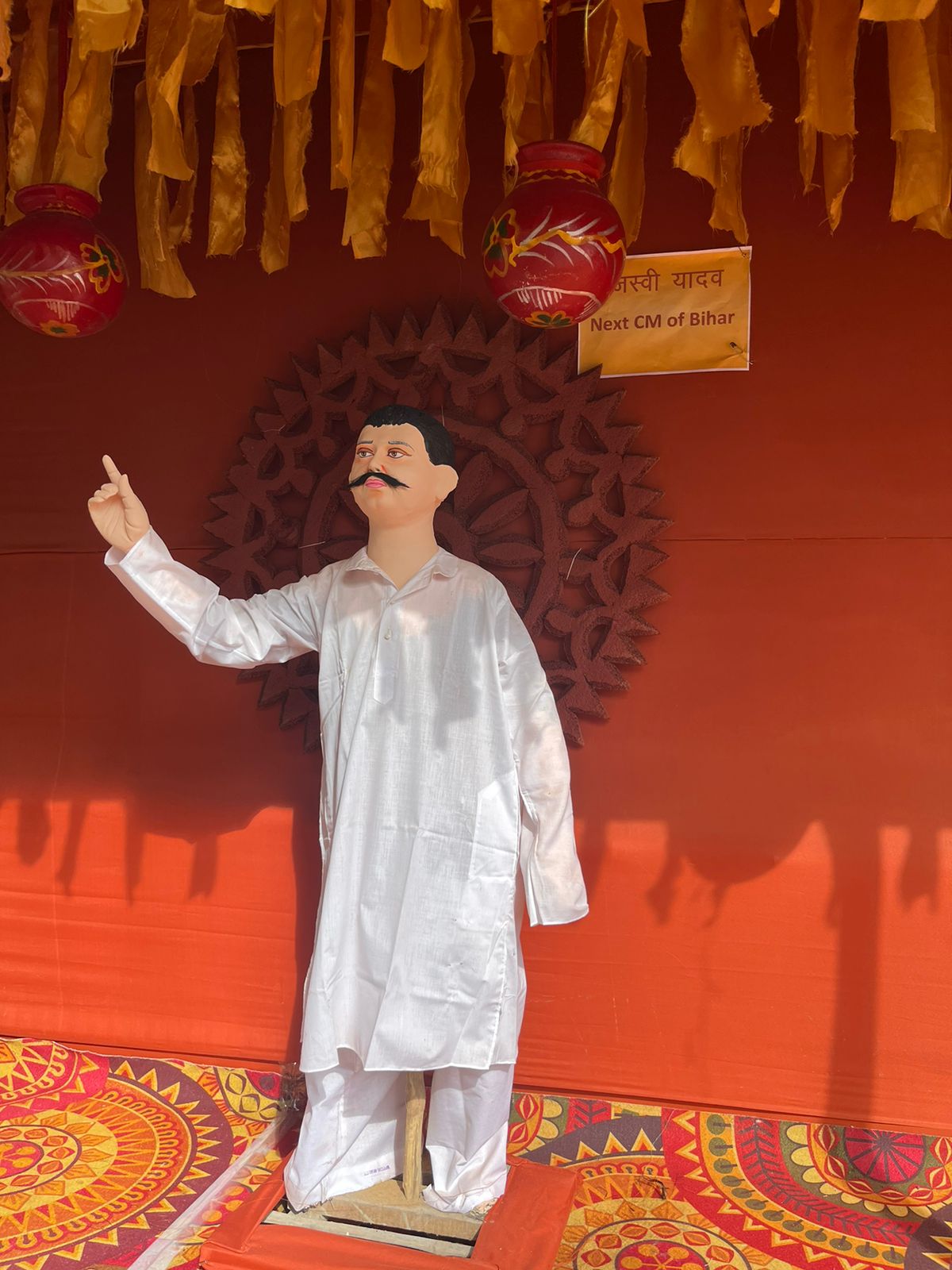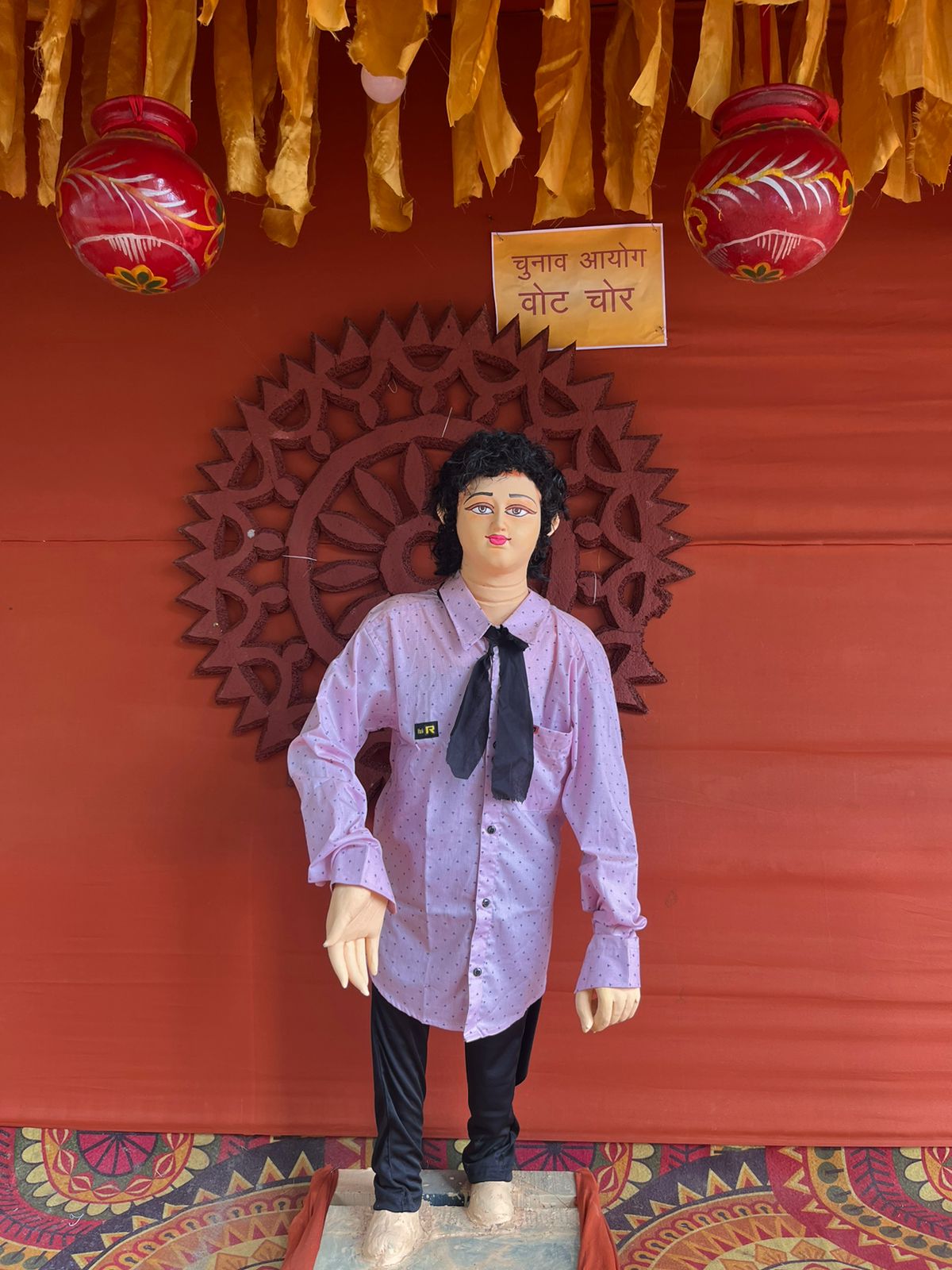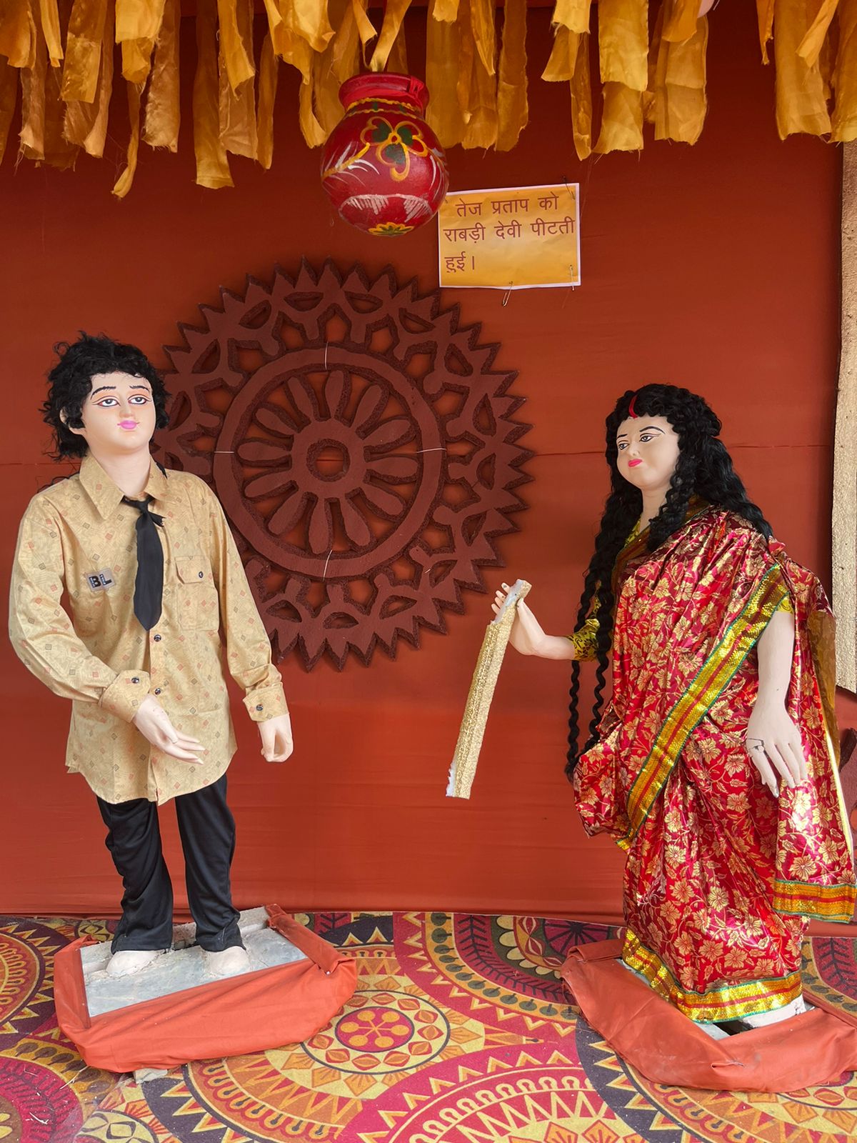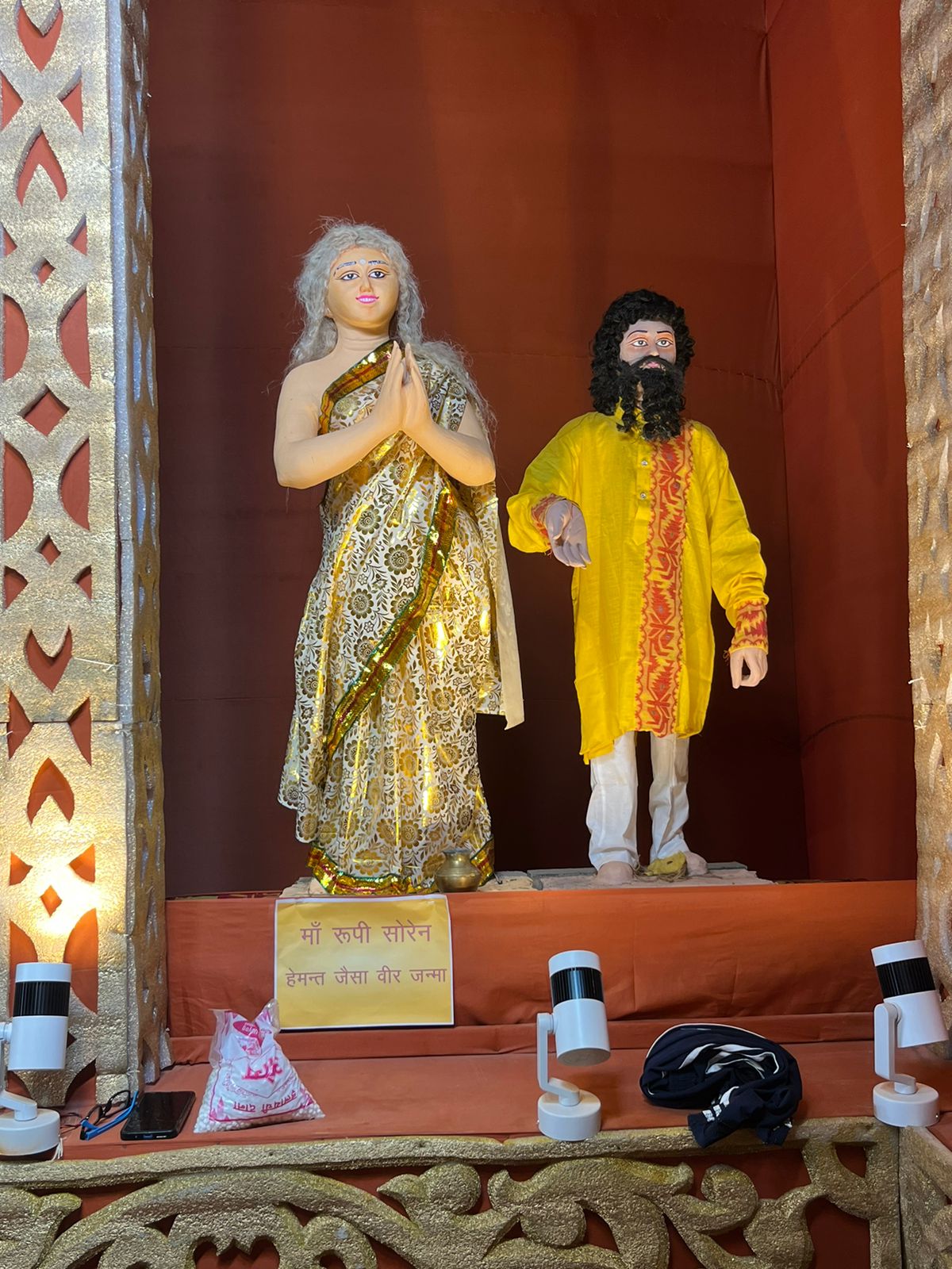 रांची का एक और पूजा पंडाल सुर्खियों में आया है। वजह है मां दुर्गा की प्रतिमा के साथ-साथ पंडाल में झारखंड के मुख्यमंत्री हेमंत सोरेन, उनकी मां रूपी सोरेन और बिहार के पूर्व मुख्यमंत्री लालू यादव तथा उनकी मां मरछिया देवी की प्रतिमा लगाना। इतना ही नहीं, पूजा पंडाल के बगल में एक और पंडाल बनाया गया है जिसमें कांग्रेस नेता राहुल गांधी को पीएम इन वेटिंग और तेजस्वी यादव को बिहार का भावी मुख्यमंत्री बताया गया है। इसके अलावा, एक प्रतिमा बनाकर उसके पीछे पोस्टर लगाकर लिखा गया है "चुनाव आयोग वोट चोर"। तेज प्रताप यादव की प्रतिमा भी बनाई गई है, लेकिन इसमें राबड़ी देवी उन्हें पीटते हुए दिख रही हैं।