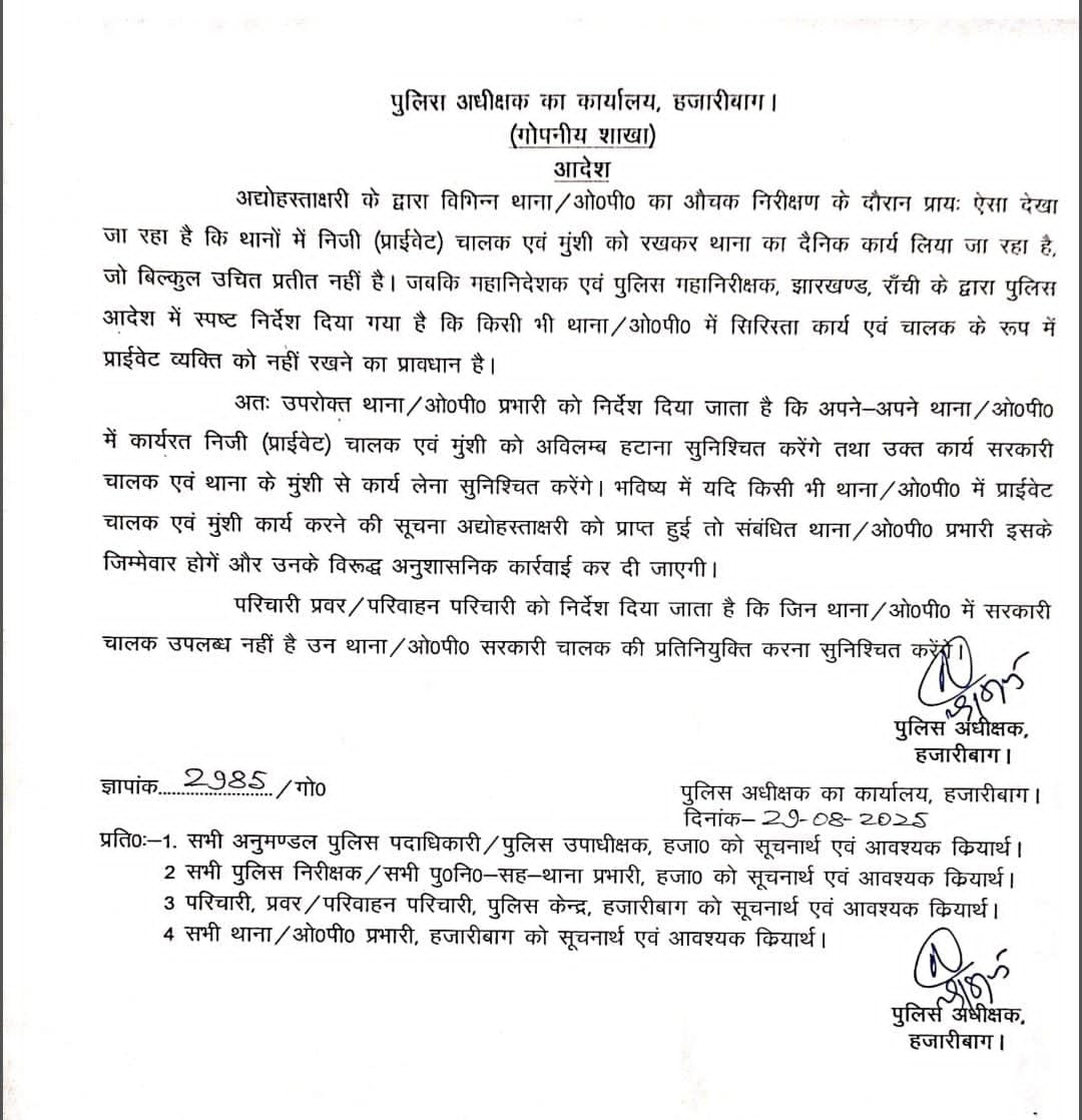 हजारीबाग पुलिस अधीक्षक ने थानों में प्राइवेट ड्राइवर और मुंशी के काम पर रोक लगा दी है। यह आदेश औचक निरीक्षण के दौरान गड़बड़ी पाए जाने के बाद जारी किया गया, जब यह पता चला कि कई थानों में निजी कर्मियों से काम कराया जा रहा था। डीजीपी के आदेश का पालन न होने पर पुलिस अधीक्षक ने नाराज़गी जाहिर की और अब केवल सरकारी ड्राइवर और मुंशी ही थाने में काम करेंगे। अगर किसी थाना में प्राइवेट कर्मी पाए गए, तो थाना प्रभारी को जिम्मेदार ठहराया जाएगा और दोषी थाना प्रभारी के खिलाफ अनुशासनात्मक कार्रवाई की जाएगी। जिन थानों में चालक नहीं हैं, वहां सरकारी चालक की प्रतिनियुक्ति की जाएगी। हजारीबाग पुलिस अधीक्षक ने सभी थाना/ओपी को इस आदेश की जानकारी भेज दी है।