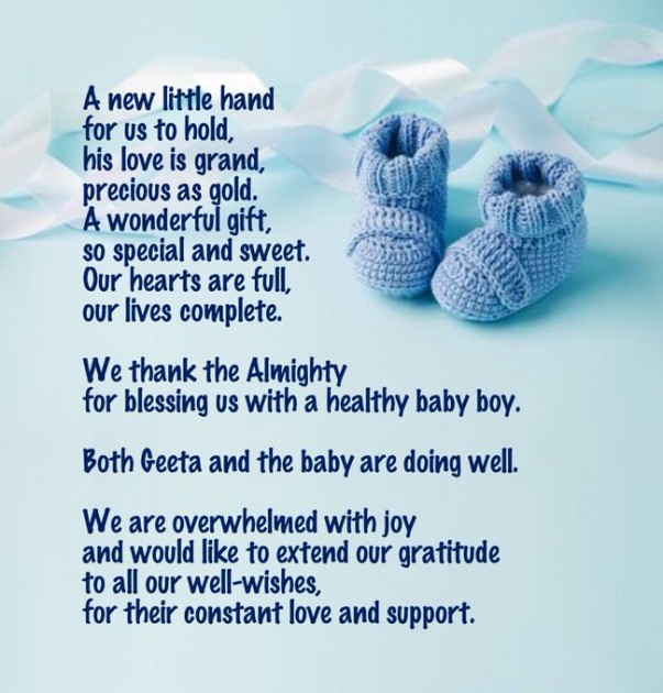 हरभजन सिंह ने अपने ऑफिशियल ट्विटर हैंडल पर लिखा कि भगवान के आशीर्वाद से हमे एक स्वस्थ और प्यारा बच्चा मिला। गीता और बच्चा दोनों ठीक हैं। हम काफी खुश हैं। वे तमाम लोग जो हमें लगातार शुभकामनाएं दे रहे हैं। प्यार और समर्थन दे रहे हैं, मैं उनका आभार व्यक्त करना चाहता हूं। हरभजन सिंह ने लिखा कि वे खुशी से अभिभूत हैं।