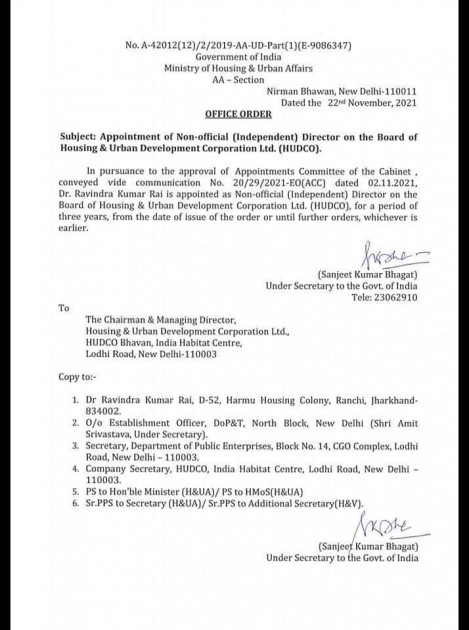 कोडरमा के पूर्व सांसद और भाजपा के पूर्व प्रदेश अध्यक्ष डाॅ. रवींद्र कुमार राय को आवास एवं नगर विकास निगम लिमिटेड यानी हुडको (द हाऊसिंग एंड अर्बन डेवलपमेट कारपोरेशन लिमिटेड) का स्वतंत्र निदेशक बनाया गया है। इस संबंध में केंद्र सरकार के अपर मुख्य सचिव संजीत कुमार भगत ने अधिसूचना जारी की है। उनका यह कार्यकाल तीन साल के लिए होगा। डाॅ. राय को हुडको का निदेशक बनाने पर भाजपा कार्यकर्ता और नेताओं के बीच खुशी का माहौल है।