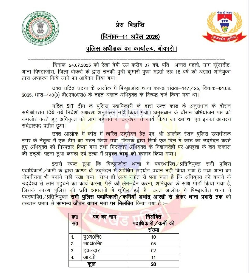 बोकारो एसपी कार्यालय की ओर से दी गई जानकारी में साफ लिखा है कि पुष्पा गुमशुदगी केस को लेकर बनी प्रारंभिक एसआईटी को वरीय पदाधिकारियों द्वारा जो भी निर्देश दिया जा रहा था, उसका अनुपालन नहीं किया गया। अभियुक्त को फायदा पहुंचाने के मकसद से पीड़ित पक्ष को कमजोर किया गया। स्पष्ट रूप से जानकारी दी गई है कि अभियुक्त और पेंड्रोजोरा थाना की पुलिस के बीच पैसों का लेन-देन हुआ और पदाधिकारियों ने हत्यारोपी के साथ पार्टी की। एसपी ने कहा कि इससे आम लोगों के बीच पुलिस की काफी नकारात्मक छवि बनी। यही वजह है कि 28 पुलिसकर्मियों को सस्पेंड करके उनके विरुद्ध विभागीय कार्रवाई का निर्देश दिया गया।