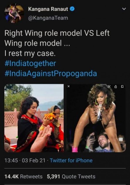 अब आप सोच रहे होंगे इस बार कंगना ने क्या टिप्पणी कर दी। दरअसल इस बार कंगना अपने कमेंट को लेकर नहीं बल्कि कपड़ों की वजह से ट्रोल हो रही हैं। क्यों का उत्तर समझने से पहले आपको कुछ और समझना चाहिए। आप नीचे दी गयी तस्वीर को देखिए। ये ट्वीट खुद कंगना ने 2 फरवरी 2021 को किया था जिसमे उन्होंने अपने फोटो के साथ पॉप सिंगर रिहाना के फोटो के साथ कोलाज (collage) बनाया था। कंगना भारतीय कपड़ों में नजर आ रही हैं और रिहाना वेस्टर्न कपड़ों में। कंगना ने इसमें दो अलग-अलग विचारधारा की तरफ इंगित करते हुए कहा था कि रिहाना एक खास विचारधारा की आदर्श हैं जबकि वो राष्ट्रवादी विचारधारा के लोगों की आदर्श हैं। कैप्शन में लिखा था दक्षिणपंथियों की प्रेरणास्रोत और वामपंथियों की प्रेरणास्रोत। मै बस इतना ही कहना चाहती हूँ। "
